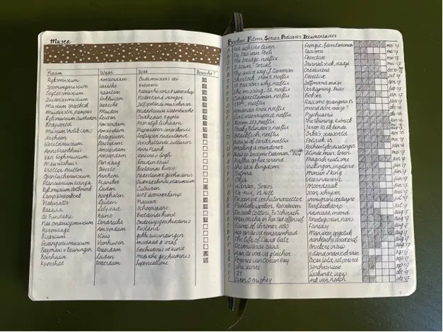 Meestal maak ik eerst een kalenderjaar-overzicht. Dit past op 1 pagina. De ander pagina maak ik een opzet voor iets anders. In dit geval van een lijstje van musea, concerten en dergelijke.