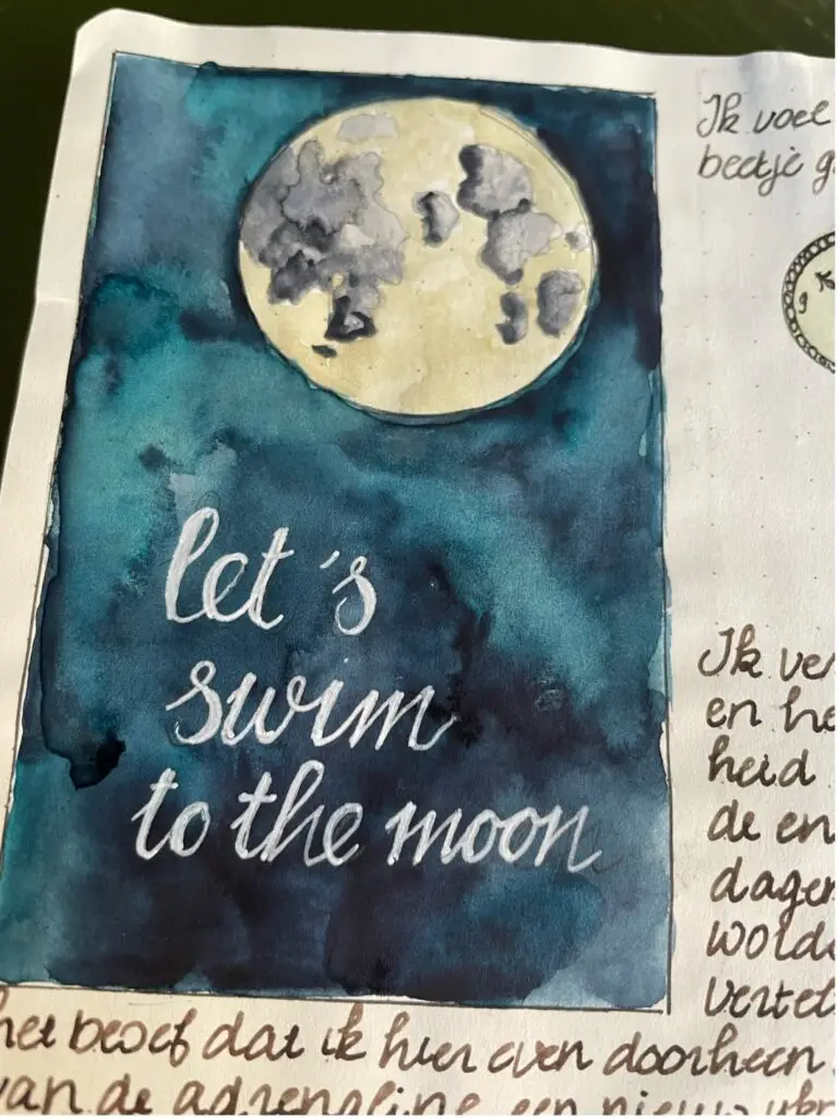 Ik plak kaartjes, maak kleine tekeningen, plak veren en foto’s, tickets en maak van het hele boekje een geheel eigen document.